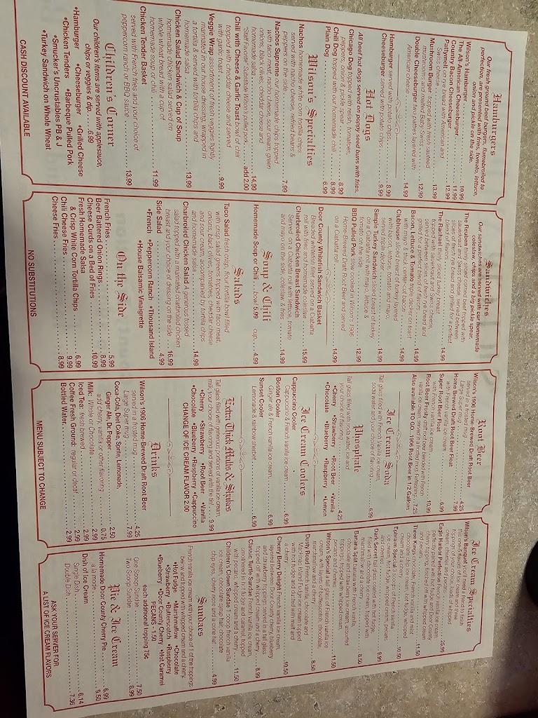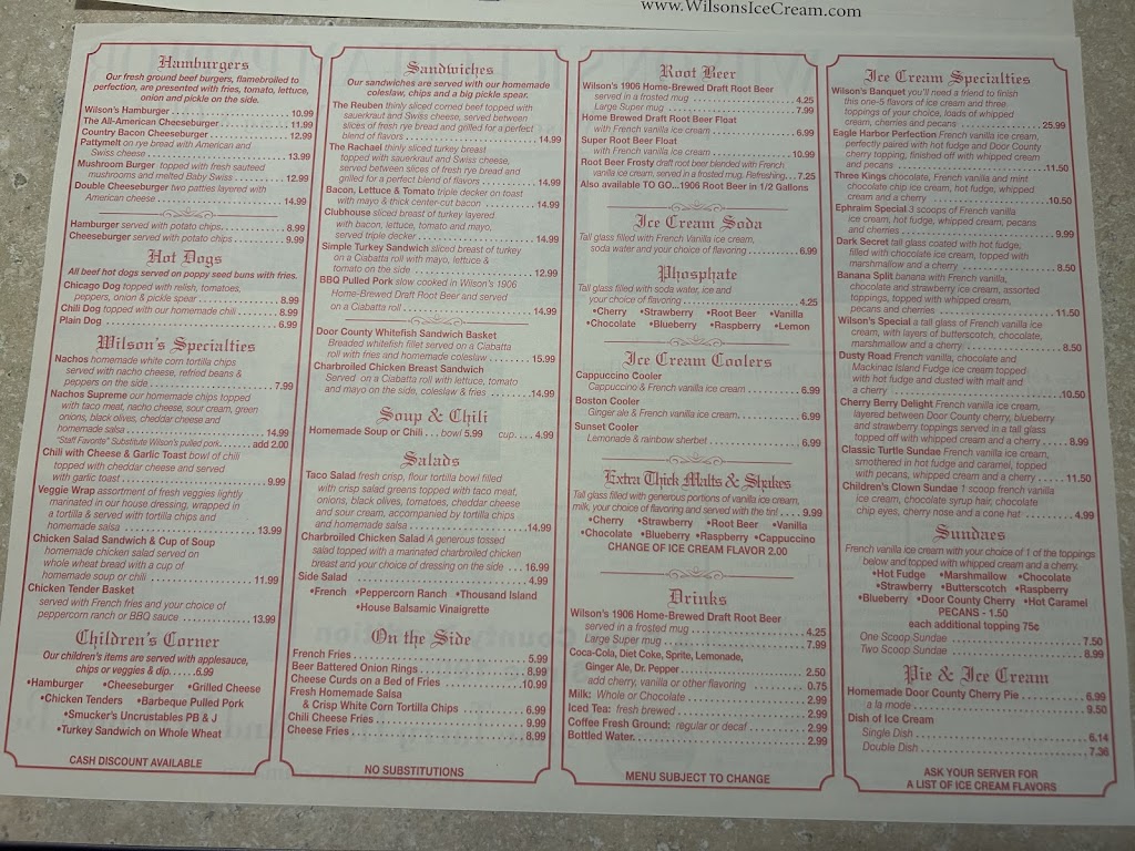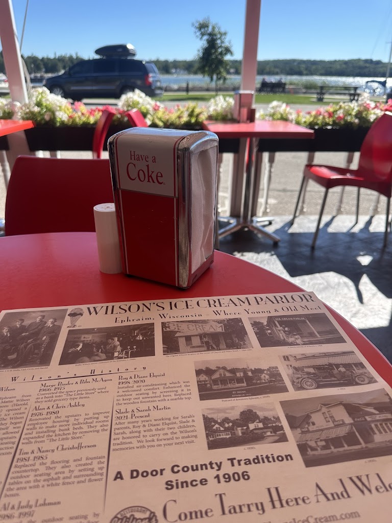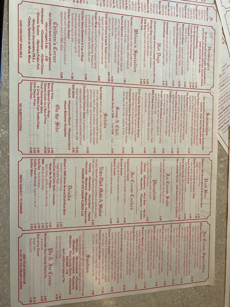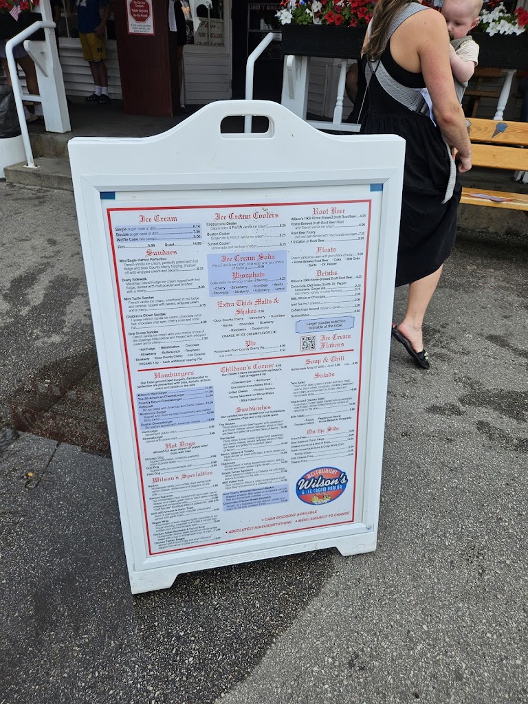 if a business never advertises but still has a line out the door, they’re doing something right. staff is always attentive and friendly. food comes in a timely manner, at a very affordable price, especially for in door county. the ice cream prices seem high, but portions are HUGE. a single scoop is NOT one scoop but instead a packed bowl of ice cream pouring out the sides. they also have a good merchandise selection, and the decorations inside are very nice. there’s also a section by the outdoor patio where the whole wall is art of wilson’s done by various artists. definitely recommend, and eat here multiple times during a visit to door county