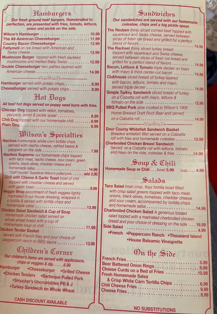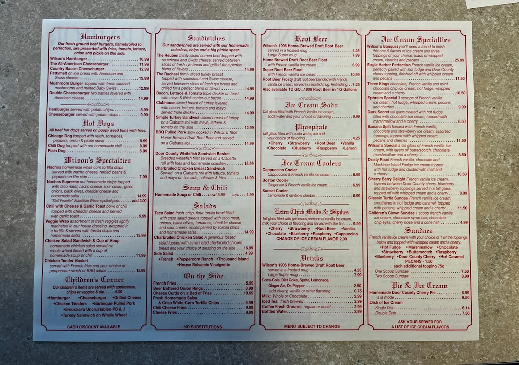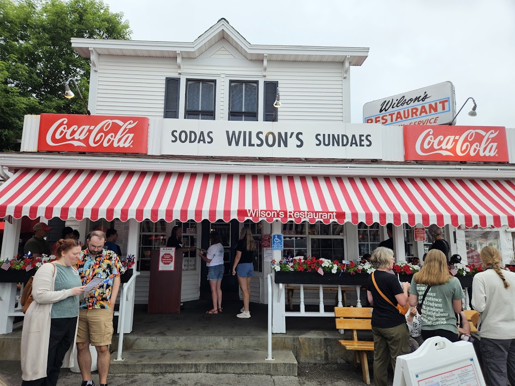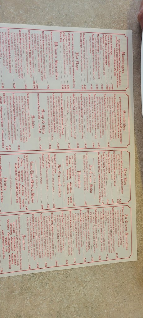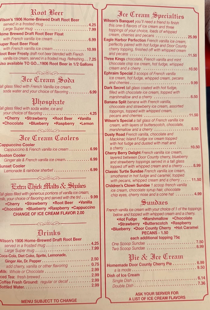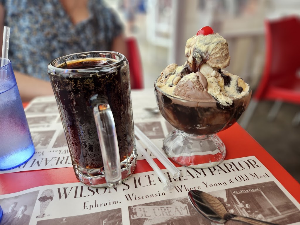 if a business never advertises but still has a line out the door, they’re doing something right. staff is always attentive and friendly. food comes in a timely manner, at a very affordable price, especially for in door county. the ice cream prices seem high, but portions are HUGE. a single scoop is NOT one scoop but instead a packed bowl of ice cream pouring out the sides. they also have a good merchandise selection, and the decorations inside are very nice. there’s also a section by the outdoor patio where the whole wall is art of wilson’s done by various artists. definitely recommend, and eat here multiple times during a visit to door county