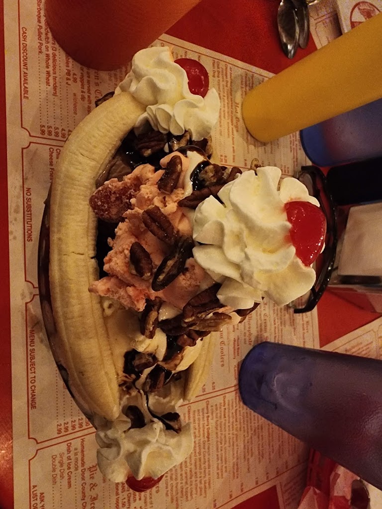 Dusty roads are my favorite! So are all the ice cream sundaes! It's a go-to when we need an ice cream fix. Food is pretty average. also, it's not wheel chair accessible, just an fyi.
