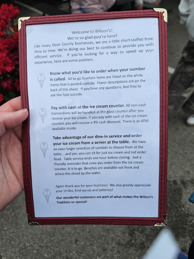 We really like that we were given a number to go into the restaurant for our ice cream order rather than everyone cramming inside. Great ice cream and a must stop while in Door County.