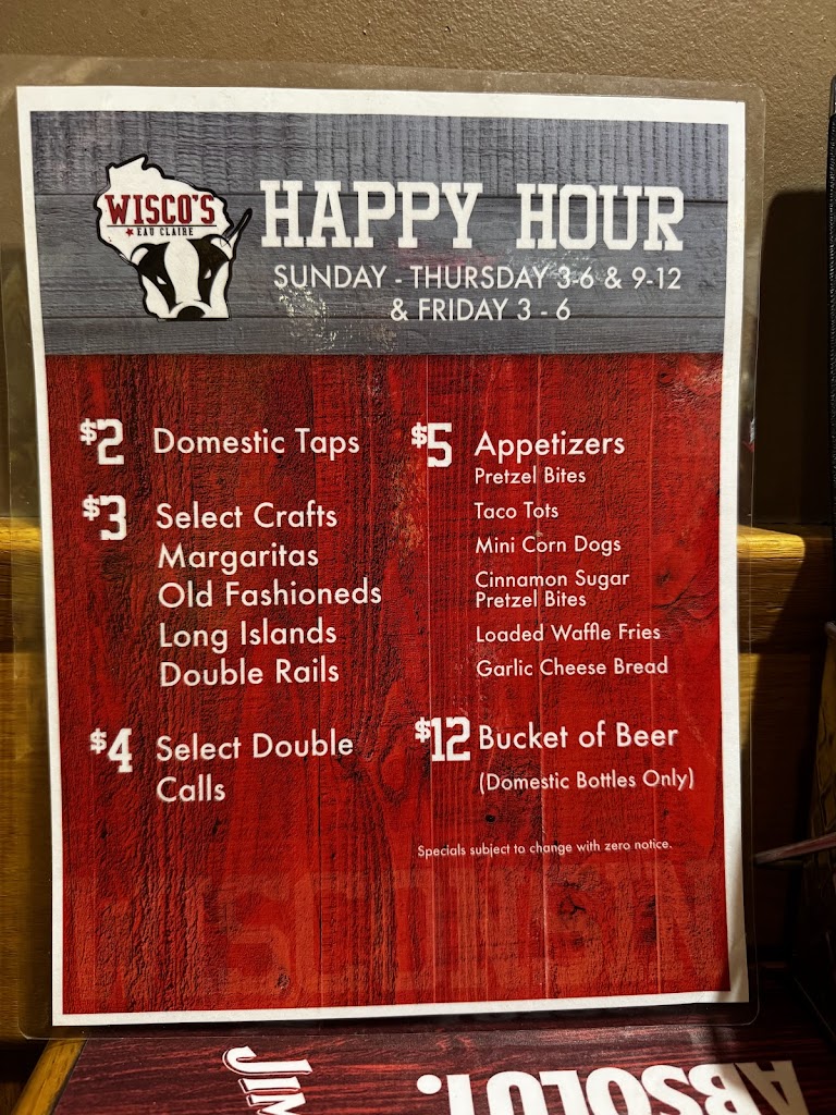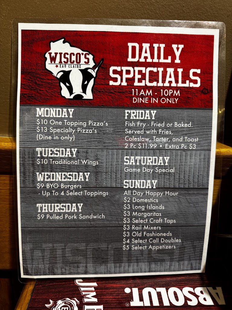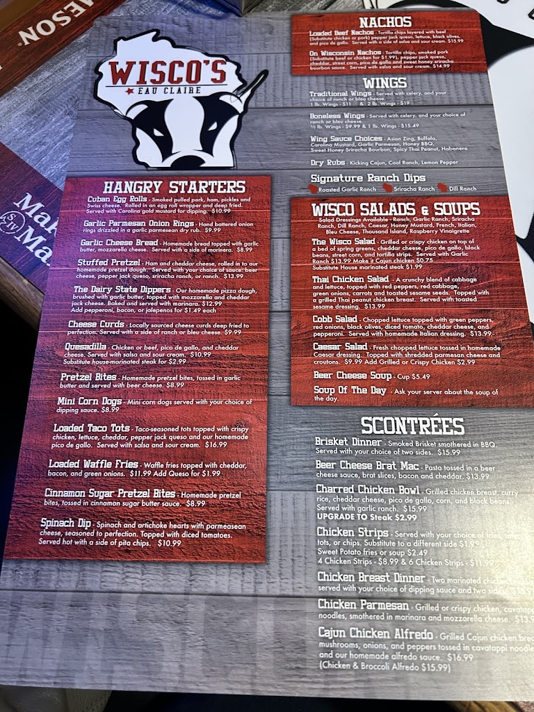 Discover Wisco's Bar & Eatery, a premier sports bar and good steaks restaurant nestled at 1920 S Hastings Way, Eau Claire. Since opening in 2019, Wisco's has become a local favorite for its vibrant atmosphere, delectable homemade dishes, and unique Wisconsin flavors. Relish 24 diverse tap beers and savor mouthwatering creations like our signature Fish Fry, hearty burgers, and customizable pizzas. As a top gambling bar, enjoy gaming and daily specials while catching your favorite sports events on big screens. Join us at Wisco's for a lively community experience, where great food and fun meet in Eau Claire.