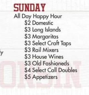 After seeing all day Sunday happy hour sign out front I was disappointed to get our bill and realize nothing we had was on special. I blame myself for not asking more questions, but I wish the bartender would have explained what was on special, and what was not.