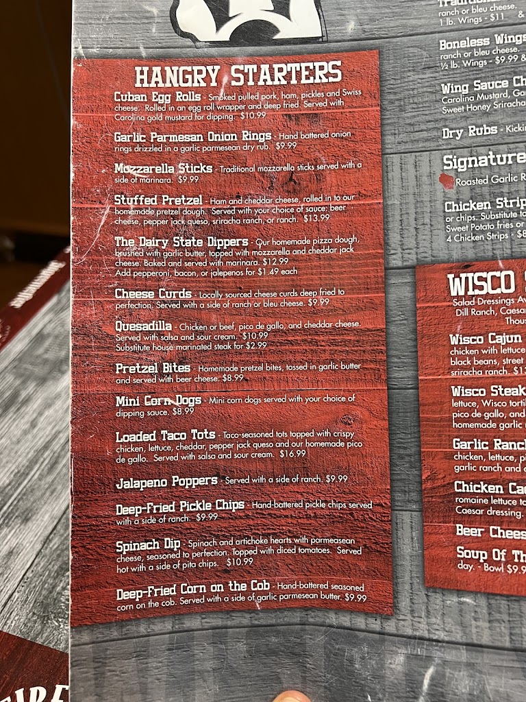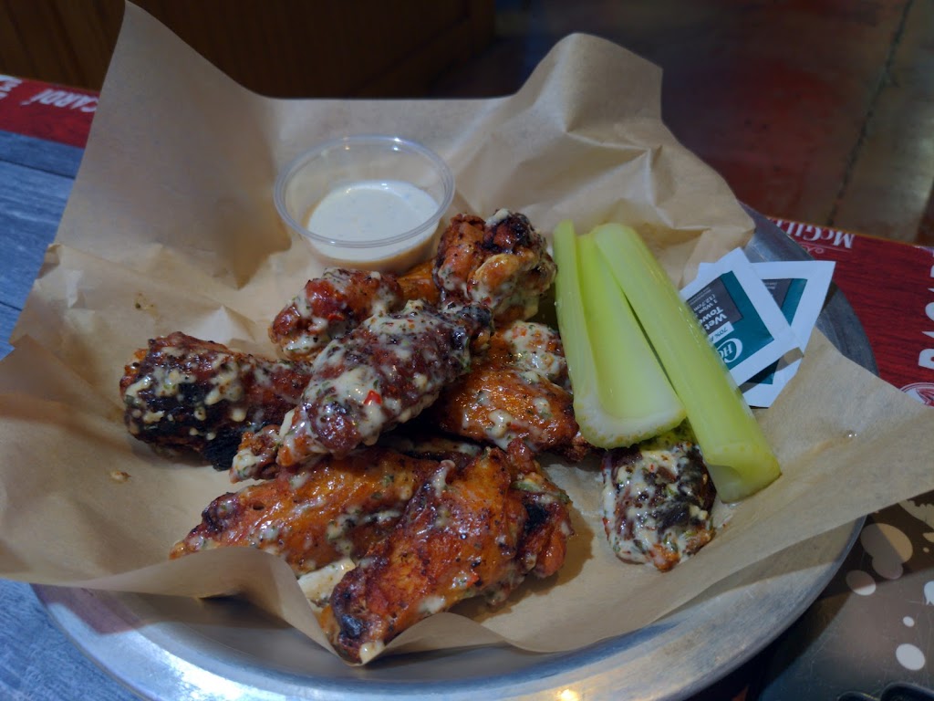 My husband had the wings and enjoyed them. I ordered the Wisco Melt. Had I known the grilled chicken was small pieces of chicken that seemed to be what would be used for a quesidilla, I would have ordered something else. Alot of bread and cheese, very little chicken. Service was good.