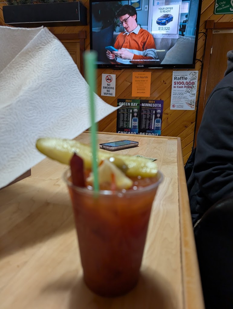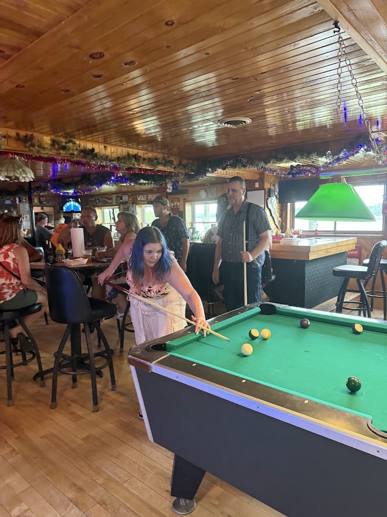 We stopped here for lunch while out trail riding on a Sunday. Upon stopping in we were greeted by very friendly bar staff. She got us set up with some beers and bloody Mary’s! We all ordered the wolf burger. This thing was huge and very good! Will definitely be stopping by here again