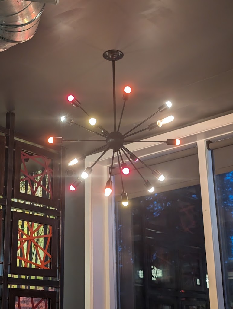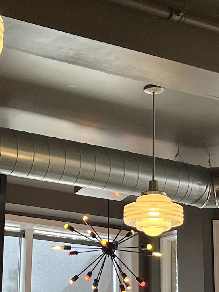 Lighting choice at the entrance is cool but clashes with the main lighting. I guess if you were going for an adderall fueled futuristic retro 50s update… this still isn’t it.