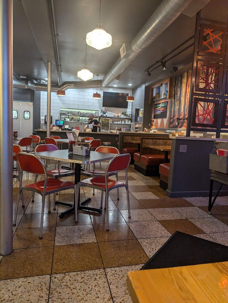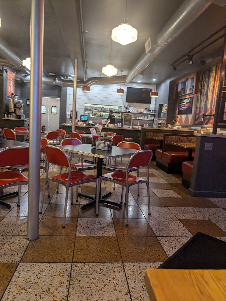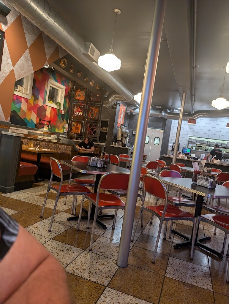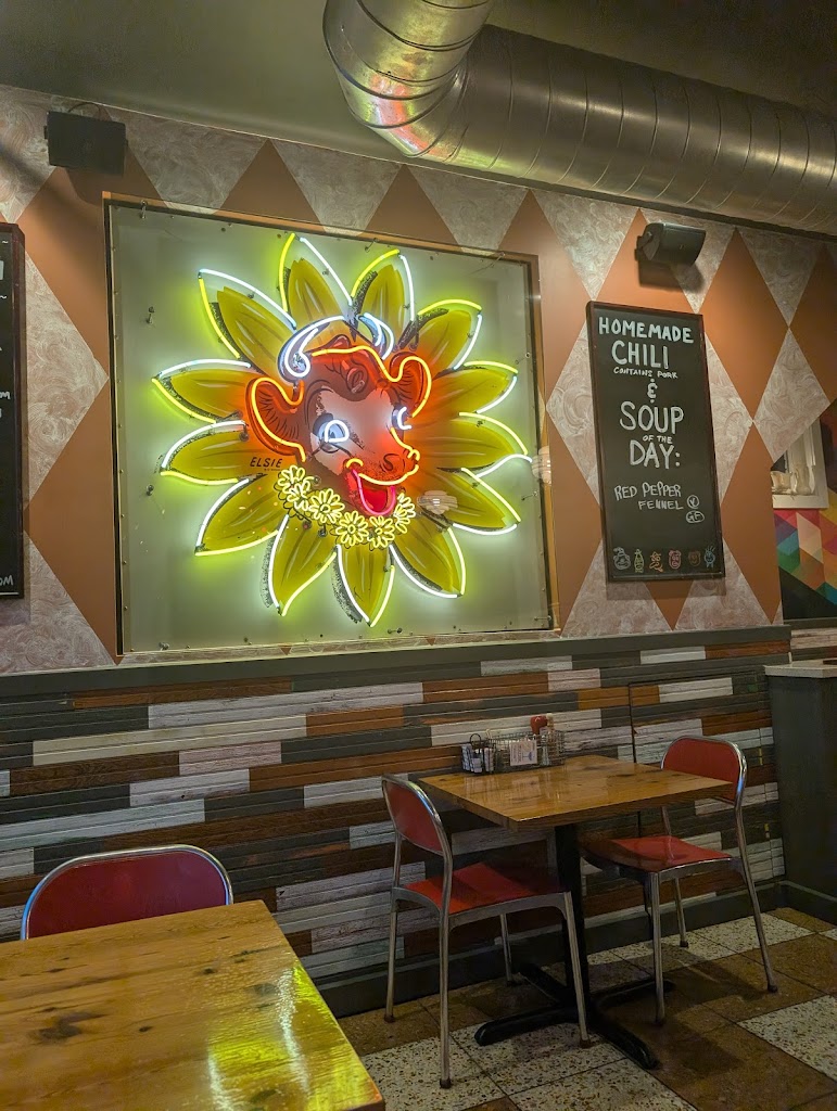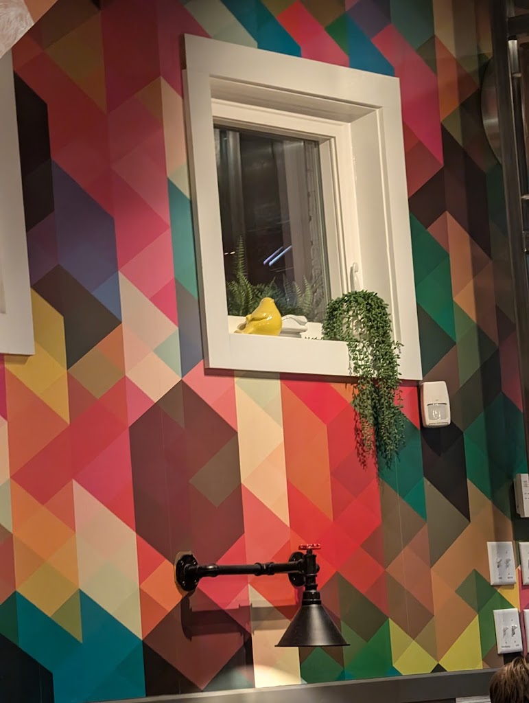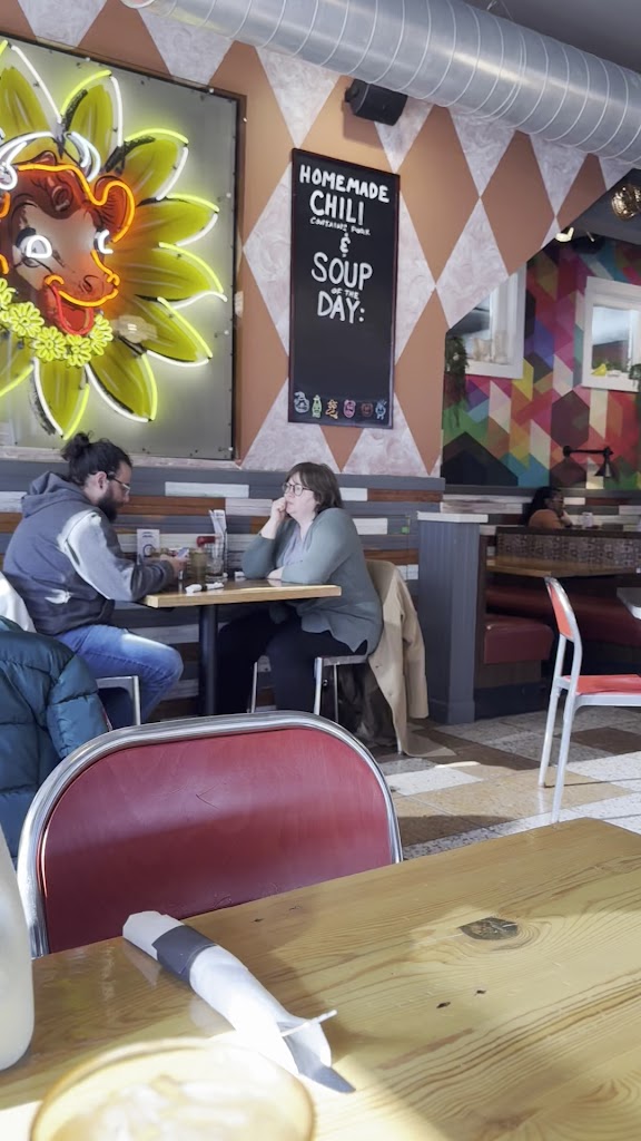 The decor, looks like 20 art students had a competition to have the most cliche and unharmonious design elements crammed into a single space to the point of feeling a bit dizzy after a few mins. Comfortable booths with ugly upholstery from bench to drapes. Decent 50s style tables, they should have leaned into the design of w the sharp look of the bar area, could have been classy retro. But it’s all over the place w circus patterned walls backdropping what could be a cute cow neon light if not for the horrific design elements around it. Nice photo realistic mural of nature and cool rainbow geometric murals battle one another in a baffling display in the main entrance room. It looks like someone with ADHD went on a buying spree of clearance design elements. The floor wouldn’t be so bad if everything else wasn’t so confused.