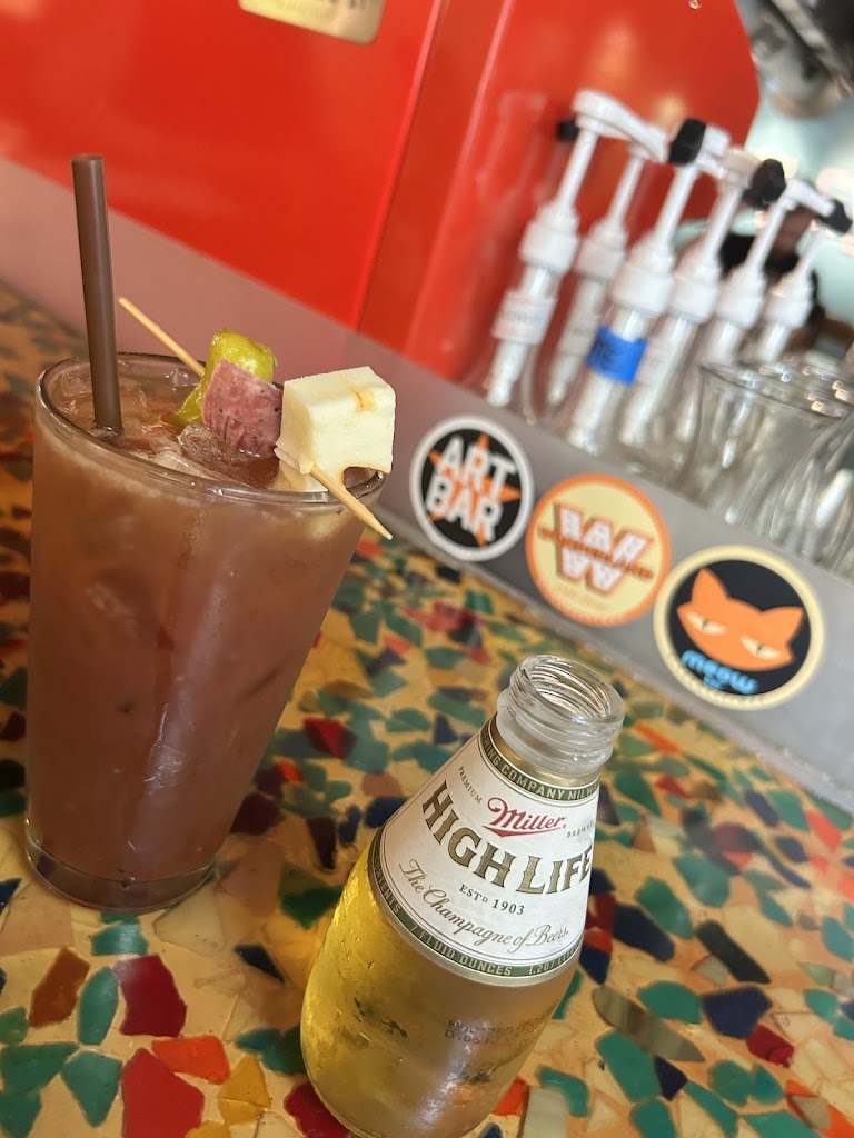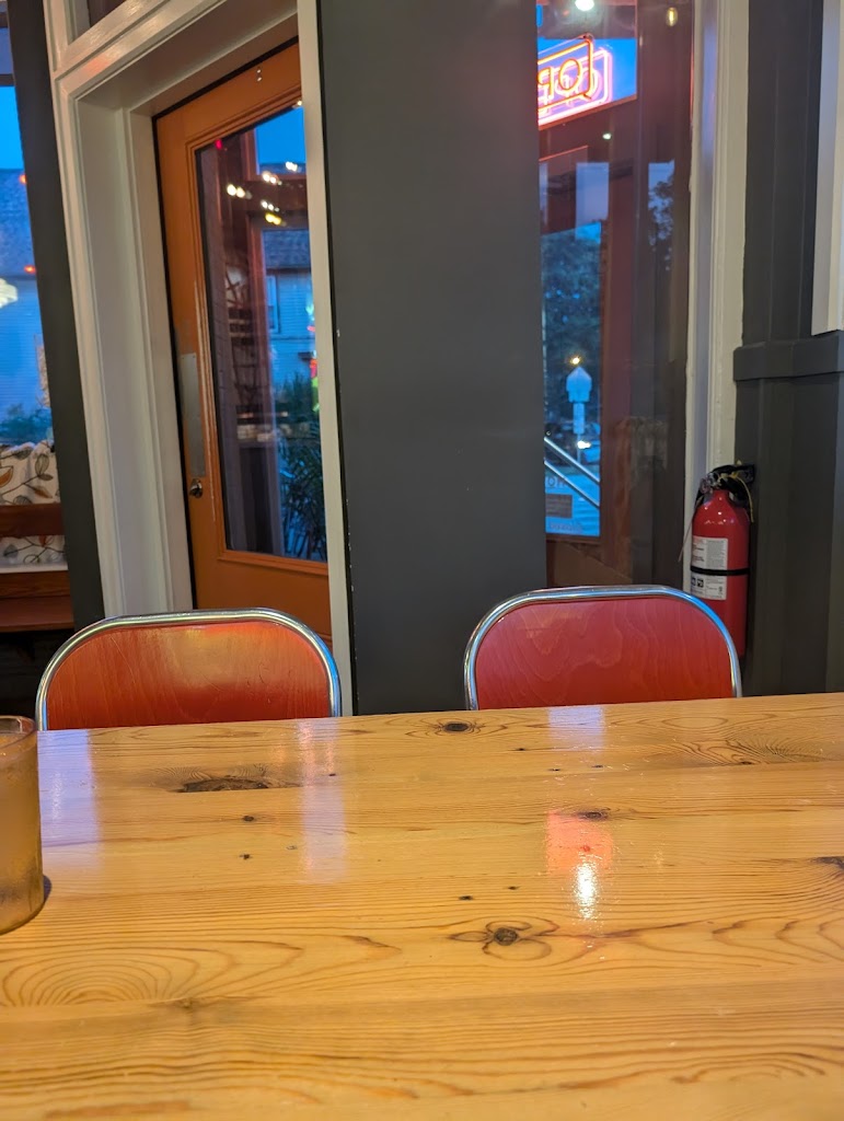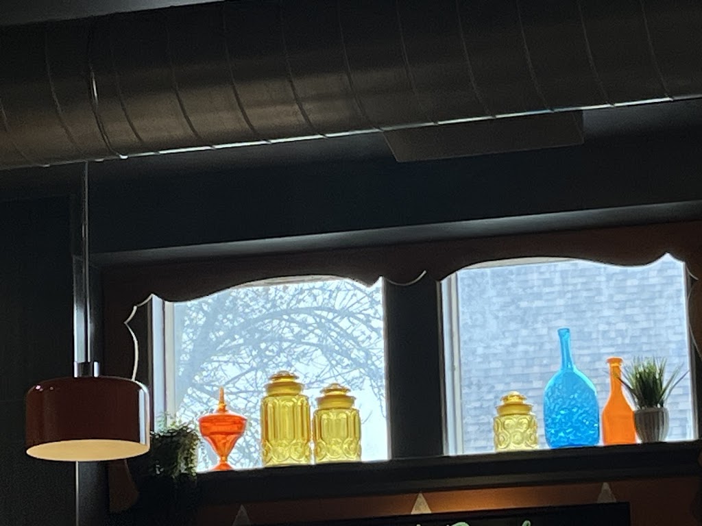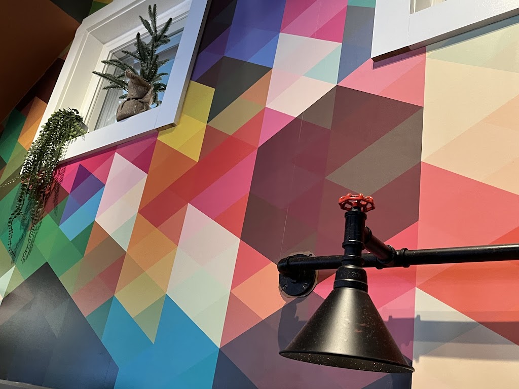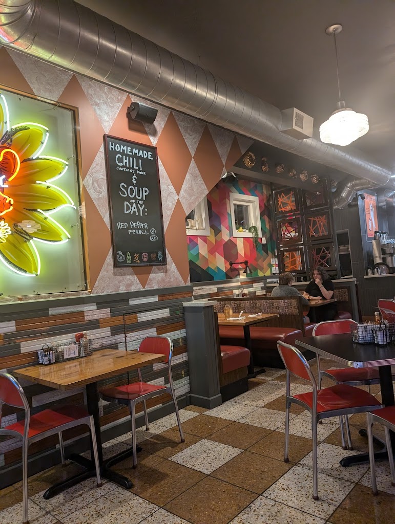 The decor, looks like 20 art students had a competition to have the most cliche and unharmonious design elements crammed into a single space to the point of feeling a bit dizzy after a few mins. Comfortable booths with ugly upholstery from bench to drapes. Decent 50s style tables, they should have leaned into the design of w the sharp look of the bar area, could have been classy retro. But it’s all over the place w circus patterned walls backdropping what could be a cute cow neon light if not for the horrific design elements around it. Nice photo realistic mural of nature and cool rainbow geometric murals battle one another in a baffling display in the main entrance room. It looks like someone with ADHD went on a buying spree of clearance design elements. The floor wouldn’t be so bad if everything else wasn’t so confused.