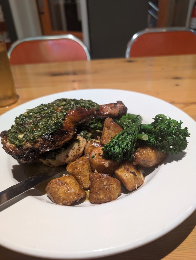 We had a really nice meal here. My partner eats meat, and I do not so this was a good spot for us. This was our first time here and I think I expected some thing a little more upscale. However, it was great it was very comfortable and inviting the music happened to the excellent while we were there it was a Sunday evening and therefore, the gallery space was not open. We will have to come back to see that. Our server, whose name I unfortunately don’t remember, was absolutely wonderful, and made some great recommendations to us.