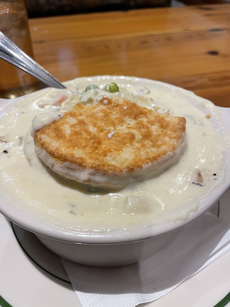 The chicken pot pie was very good. Potatoe pancakes were too chewy and the food was under seasoned.