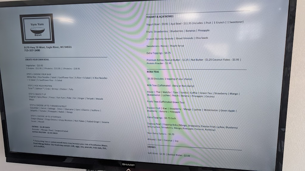 Yum Yum Bowl in Eagle River, WI, serves up fresh and flavorful options including customizable Poke Bowls, refreshing Açaí and Yogurt Bowls, and a variety of delicious Boba Teas. Whether you're looking for a healthy meal, a sweet treat, or a fun drink, we've got something for everyone. Stop in and taste the difference!