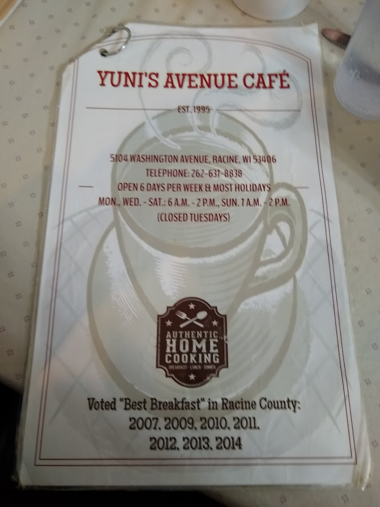 02/02/2020 update. Giving Yuni's 3 🌟 stars for quality, reasonably priced food and superior service. I dropped 2 stars because of the facility, administration and sanitation. Group of 3 adults and a baby today. My wife ordered scrambled eggs and Italian toast. My daughter ordered the chorizo omelette and I ordered a mini kielbasa skillet. The small restaurant was full but our food came quick and hot. My daughter took half of her meal home even with her 15 month old son helping her eat her meal. The bill was about $23.00 including beverages. Besides the food and service, there is nothing about this restaurant that "pop's". In fact, it's rather drab and it's obvious that things are done on the cheap. Look at my menu picture. I noticed one of the cooks with a full facial beard and no covering of the beard as required by code. I spoke with the owner about the uncovered beard and told him I would give him the opportunity to correct the situation so I wouldn't need to contact the health department. That was the first time he appeared to pay attention to what I was saying. Fortunately the cook had a hat on covering his hair but the owner did not. Fortunately the owner has short hair, but hair is hair.