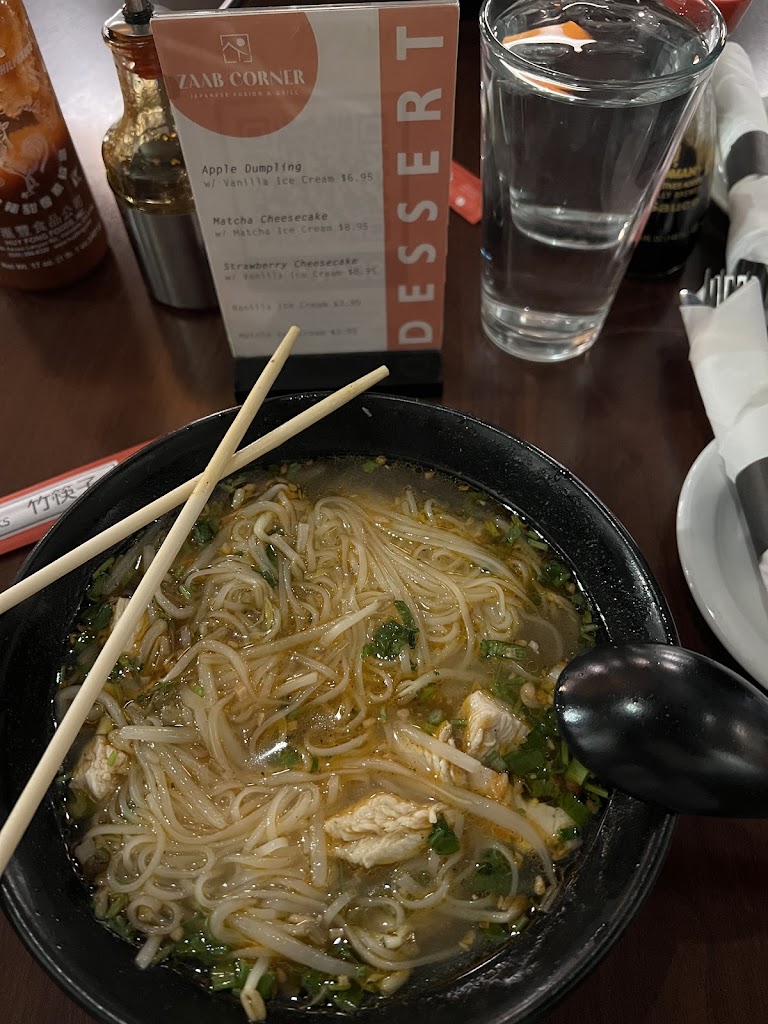 I was going to go across the street, but it looked a little bit busy and I just love Pho so I choose ZAAB. Very nice atmosphere, clean friendly and very quick to service. I went for the beef Pho and I could not believe how delicious the flavor was. I've had Pho many times before, but this really had to be the most delicious of all.I didn't even want to ruin it by adding the sauces or even a lime. Do you have a full service bar?Lots of choices there in the food is reasonably priced. When i'm in the mood, I'll be back.