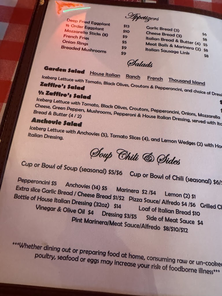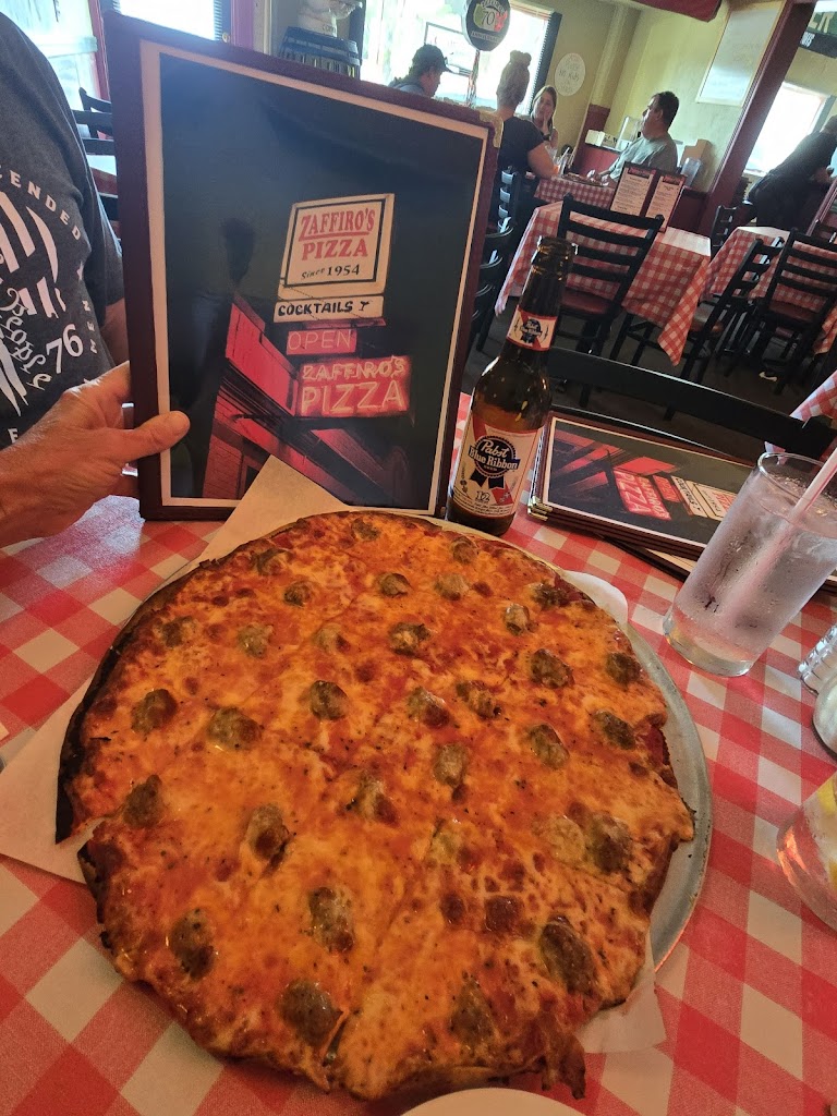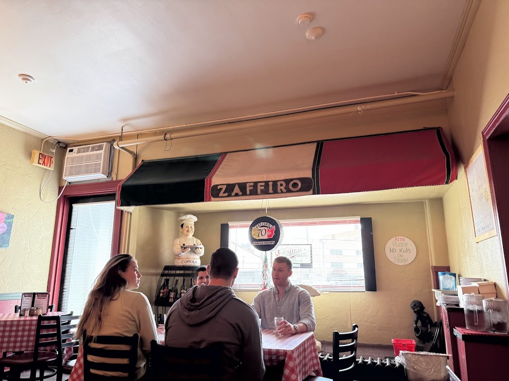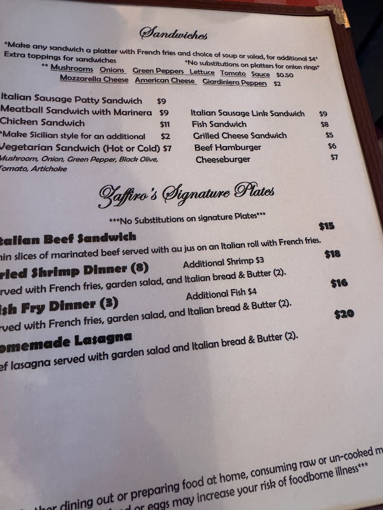 We tried their zaffiro’s salad which was good, but didn’t have any noticeable dressing in it. We split a pizza which we got half pepperoni and half sausage. The pizza was thin, and the flavor was cheesy, mild salty, and had a nice undercarriage which I appreciated. The tenderloin steak sandwich was disappointing however because the sandwich was basically a seasoned meat patty and clearly needed some toppings to add diversity in flavor. It might as well come without bread, overall I would come back for the pizza.