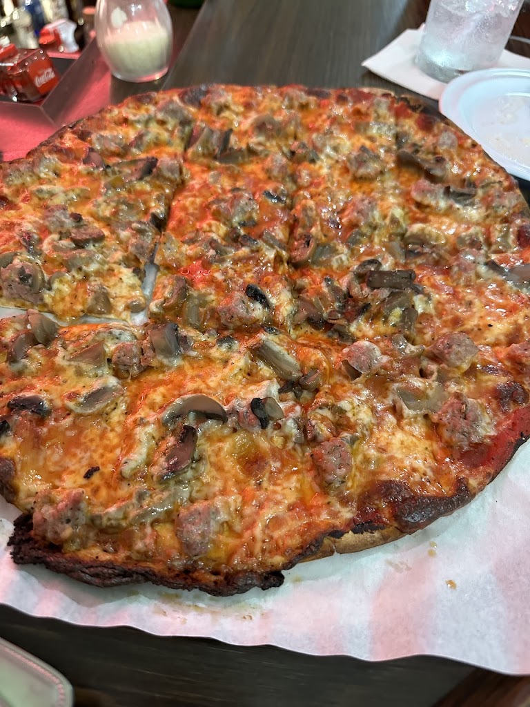 Old school vibes, you can feel the history inside as soon as u walk in. The pizza is super crispy. We had the sausage special with onion.