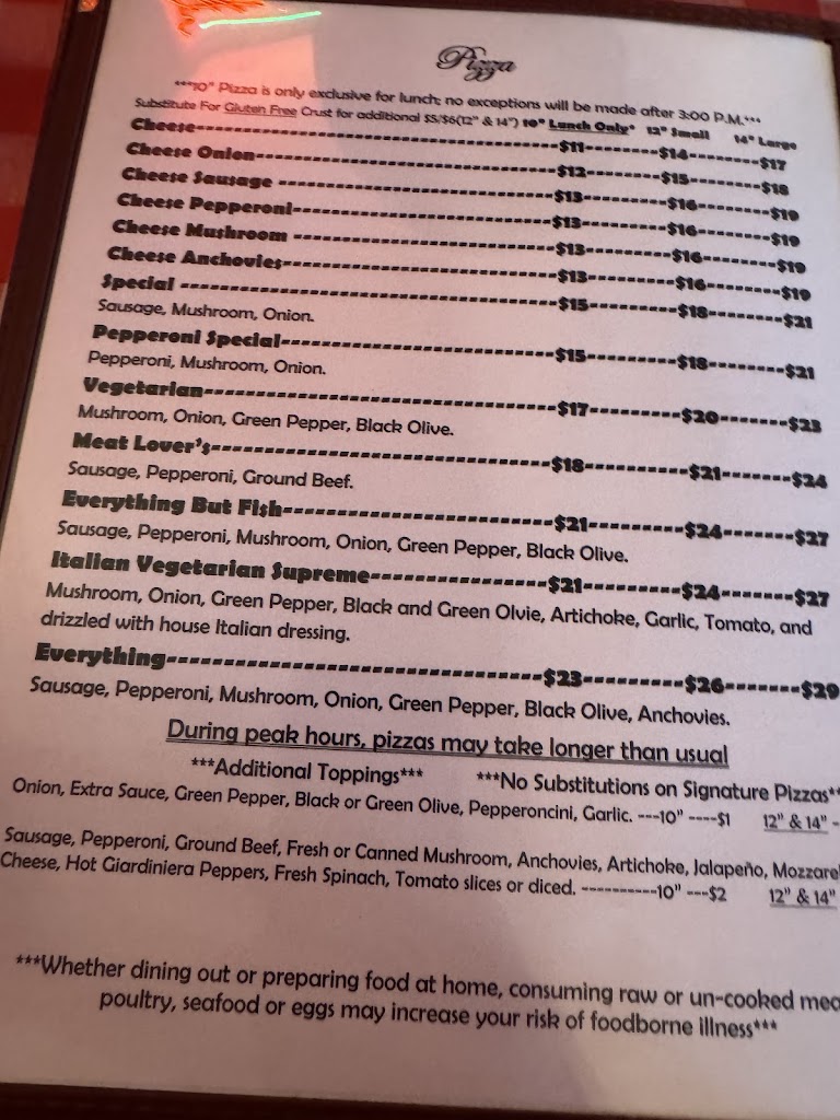 Website listed three sizes of pizza, 10”,12”,14”. I ordered 2 x 14” for delivery at 315 to be delivered “whenever the delivery guy shows up”. The young gal on the phone had no clue about anything on the menu and certainly didn’t think far enough in advance that asking someone of higher authority would be the best solution, just kept saying “I don’t know”.
