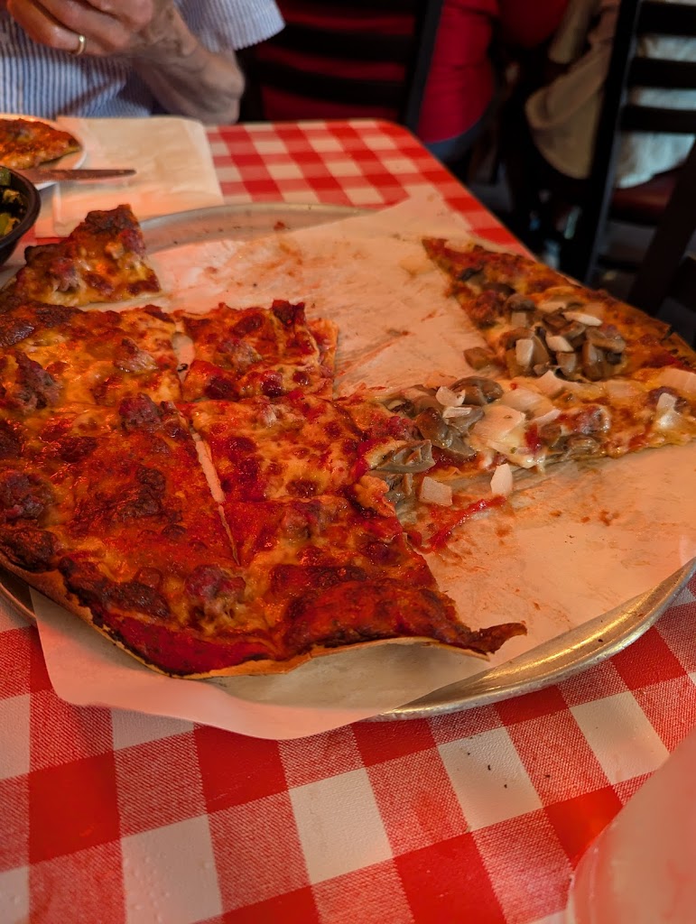 Excellent crispy thin crust pizza!. Delicious. Good atmosphere if you want old school charm. Easy public parking directly across the street.