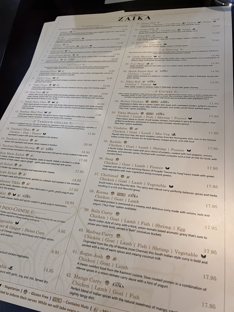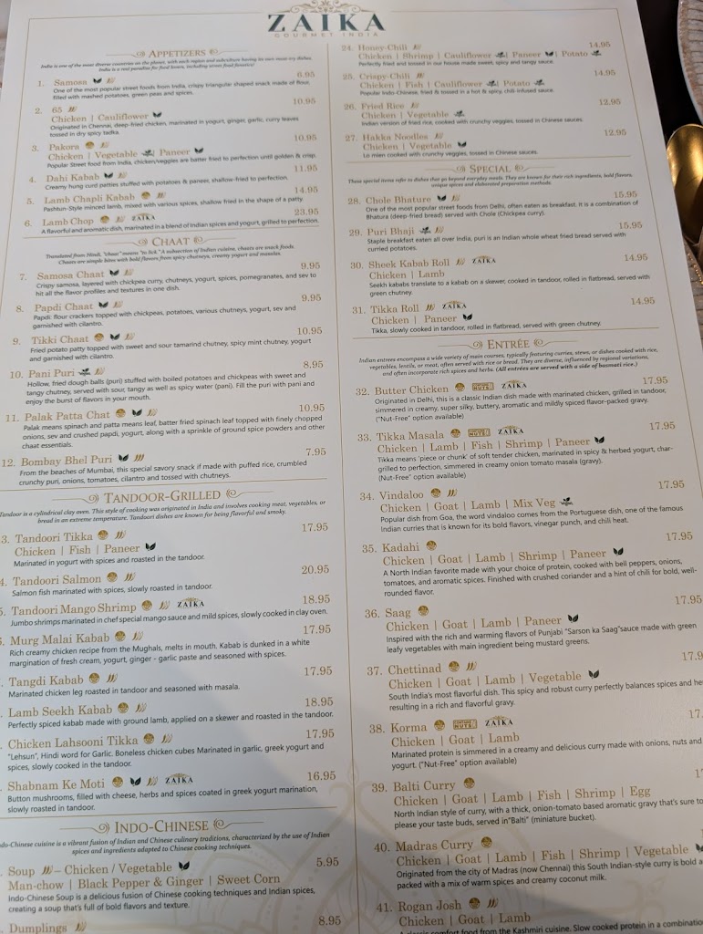 Outstanding food and service, I have been waiting for an authentic gourmet Indian restaurant to come to the area and Zaika has arrived. They have the regional foods of India which should appeal to all tastes. Highly recommended, if you like Indian cuisine you will not be disappointed.