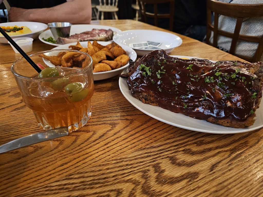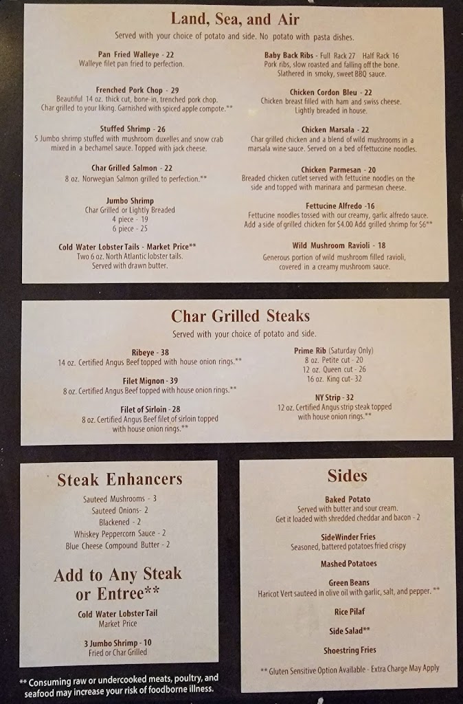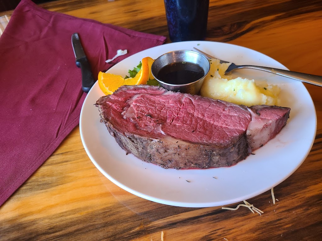 The prime rib is great, the salad bar is also good. The bar also has some fun drinks like the pink squirrel.